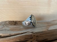 -CONSISTS OF 5 HAND-CAST ELEMENTS SOLDERED TOGETHER. RING BASE, PLATE, TOP CHARM AND TWO SIDE SHIELDS